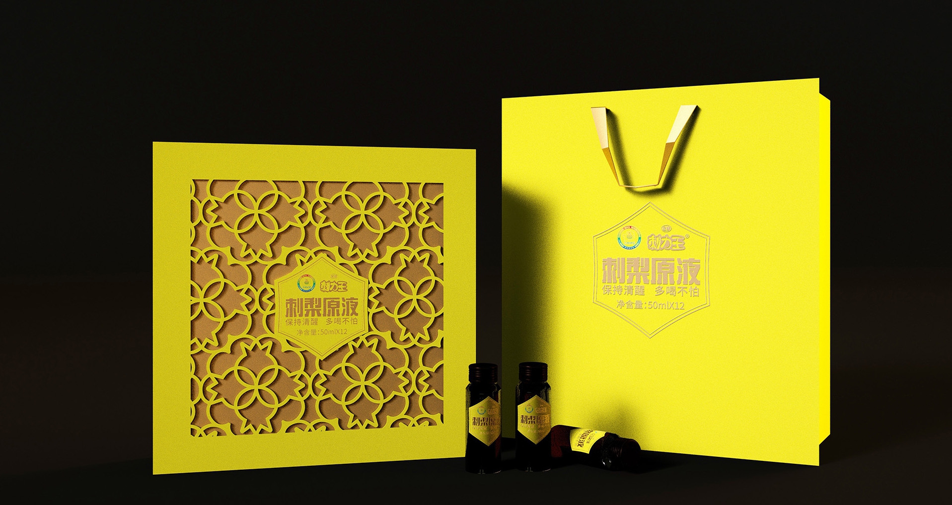 我們對(duì)刺力王進(jìn)行了包裝設(shè)計(jì)升級(jí),保留了刺梨元素,并對(duì)其進(jìn)行改良運(yùn)用,由原有的具象的插畫(huà)提取輪廓設(shè)計(jì)成紋樣,用剪紙的形式表現(xiàn)在包裝上,簡(jiǎn)約不失精致。